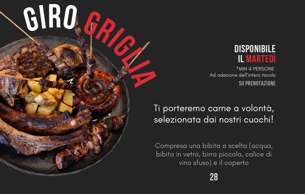 150 gr di Angus, 100 gr di filetto di Fassona piemontese, 1 spiedino di vitello, 1 hamburger di Fassona piemontese, 2 costine, 1 rotolo di salsiccia, 1 caramella. Con contorno a scelta